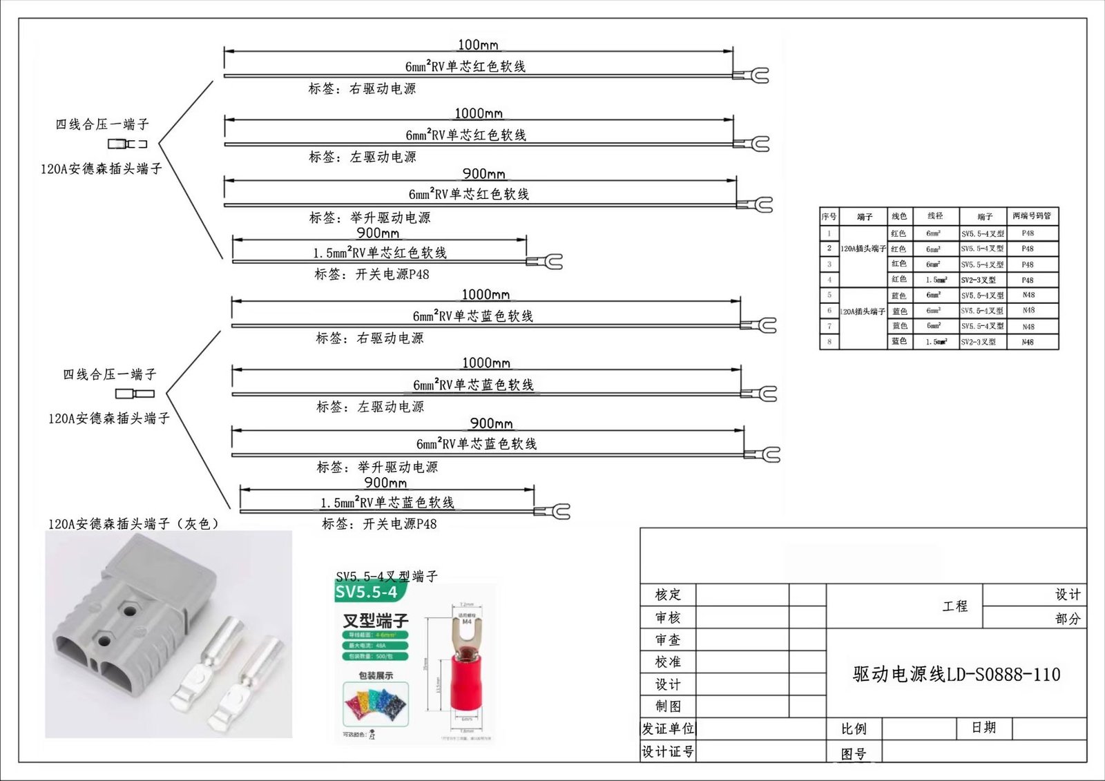 | 1 | 120A 插头端子 | 红色 | 6mm² | SV5.5-4 叉型端子 | P48 |